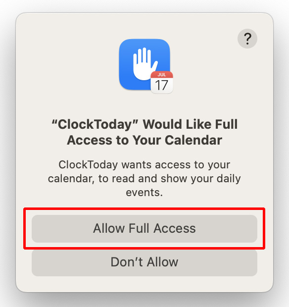 You need to give ClockToday permission to access iCalĀ® calendar.